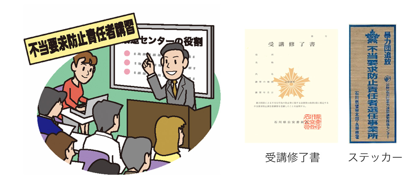 石川県暴力追放運動推進センタ-では、石川県公安委員会から委託を受け、警察や民暴弁護士と協力して、暴力団等からの不当要求による被害を防止するために「不当要求防止責任者講習」を開催しています。